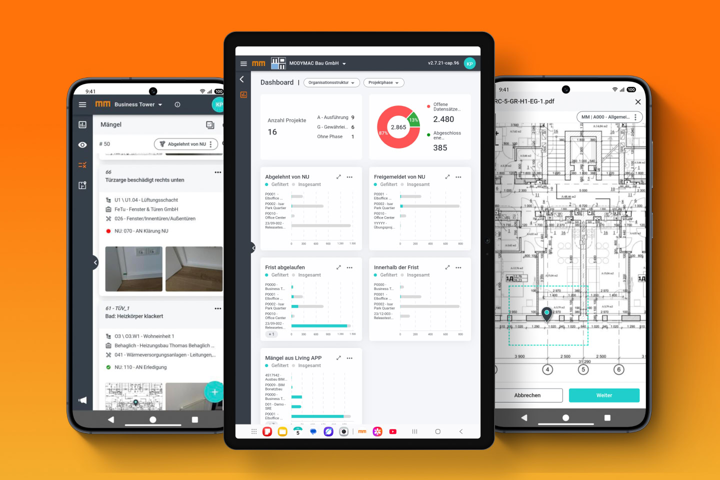 - Überall arbeiten – Mängel direkt vor Ort erfassen, dokumentieren und bearbeiten, auch offline.