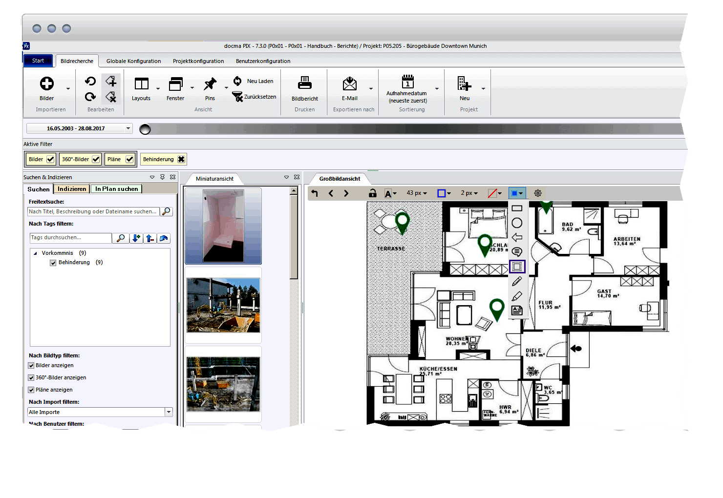 In docma PIX, you have the option of assigning images to an overview plan using a pin. With a large number of such pins in one place, the plan can become cramped and clarity suffers if the pins overlap in the image report.