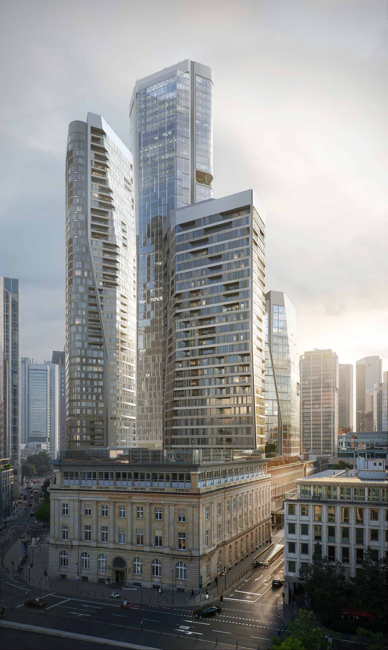 The FOUR Frankfurt opens up the area to all sides of the city centre and at the same time integrates the listed facades in Junghofstrasse with sensitivity. On the roof of the base of the building connecting all the towers, a publicly accessible garden at a height of around 25 metres invites people to linger.